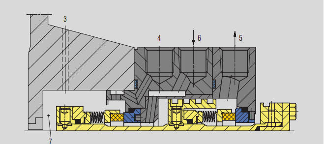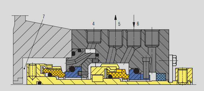 1. পাম্পের উচ্চ-চাপ এলাকা থেকে (পাম্প ডিসচার্জ বা পাম্প ডিসচার্জ পাইপলাইন) 3. ফ্লাশিং পোর্ট (F) 4.কুলার (প্রশ্ন) 5. ড্রেন পোর্ট (D) 6. সীল চেম্বার